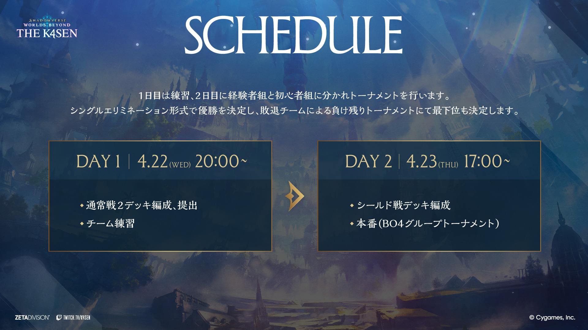 CREATOR部門のk4senが、4月22日(水)から4月23日(木)に『Shadowverse: Worlds Beyond The k4sen Supported by Cygames』を開催し、TCG部門のCQCQ、CREATOR部門のすでたき, 焼きパン, Killin9Hit, 鈴木ノリアキ, ファン太, JapaneseKoreanUG, takeraが出演いたします。