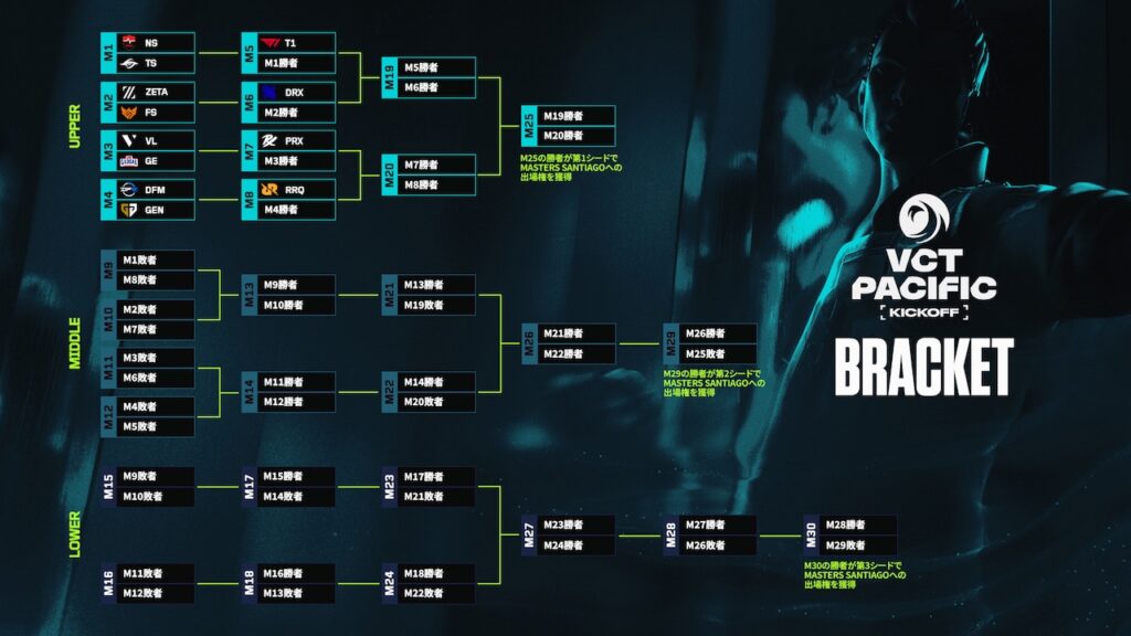 『VCTP 2026 Kickoff』は『VALORANT Masters Santiago 2026 (以下Masters Santiago)』への出場権をかけて行われる大会です。本大会では『VCT Pacific 2026』に参加している12チームがトリプルエリミネーション形式で戦います。『Champions 2025』に出場した上位4チームはシード扱いとなり、アッパーブラケットのラウンド2から参戦します。また、『Ascension 2025』から昇格した2チームはブラケット上でそれぞれ反対側に位置するように配置され、残りのチームはランダムな抽選によって配置されます。激戦を勝ち抜いた上位3チームが、2026年最初の世界大会であり、南米チリで初開催となる国際大会『Masters Santiago』への出場権を獲得します。