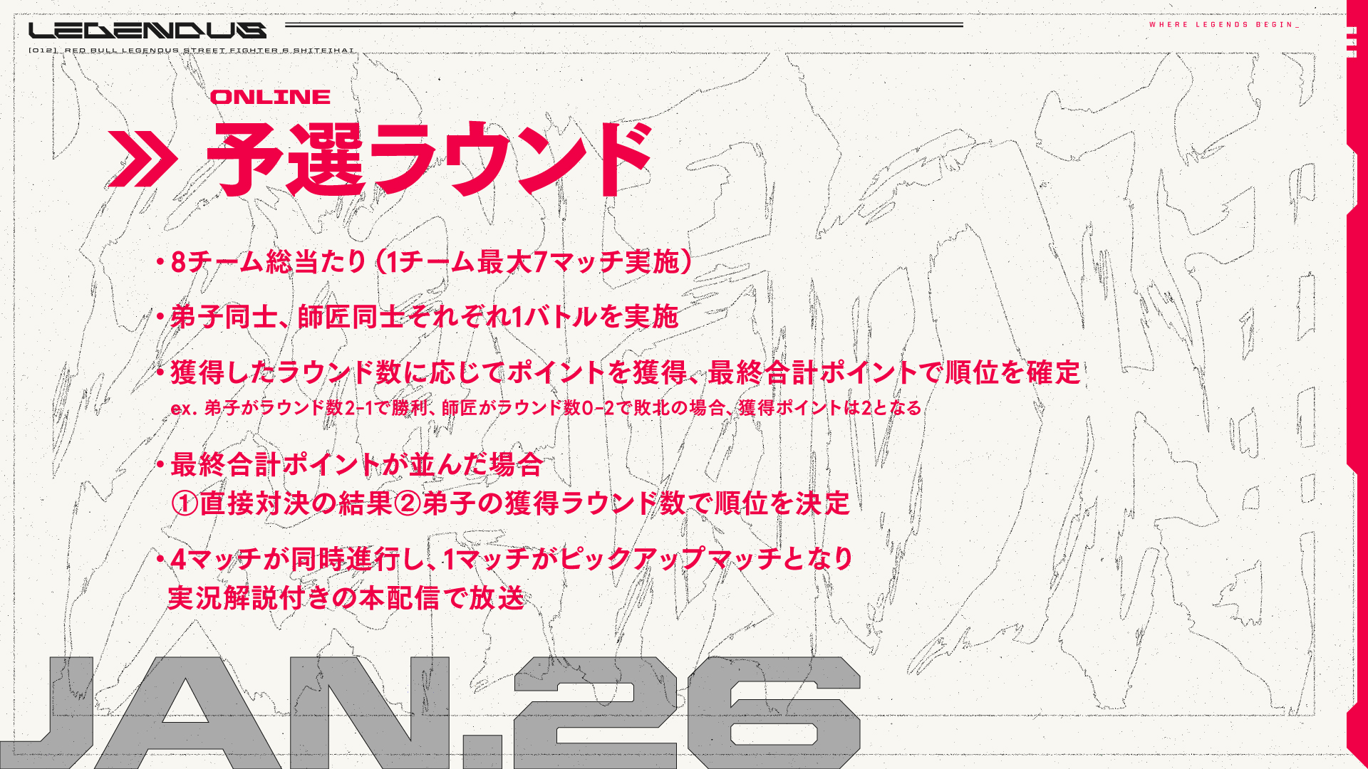 CREATOR部門のSHAKAが、1月26日(月)から1月29日(木)にかけて『Red Bull LEGENDUS STREET FIGHTER 6 師弟杯 ~2025冬 後楽園の陣~』を開催し、同部門のファン太が出演いたします。