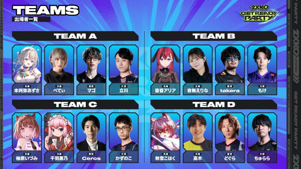 『2XKO GET READY PARTY』は、総勢16名のプロ格闘ゲーマーと人気ストリーマー達が4人1チームに分かれ、対戦する『2XKO』を用いたカジュアルイベントになります。本イベントは4チームの総当たり戦で行われ、各チームの先峰、次鋒、副将、大将が対戦し、総取得セット数の多い2チームがGRAND FINALへ進出し優勝を競い合います。