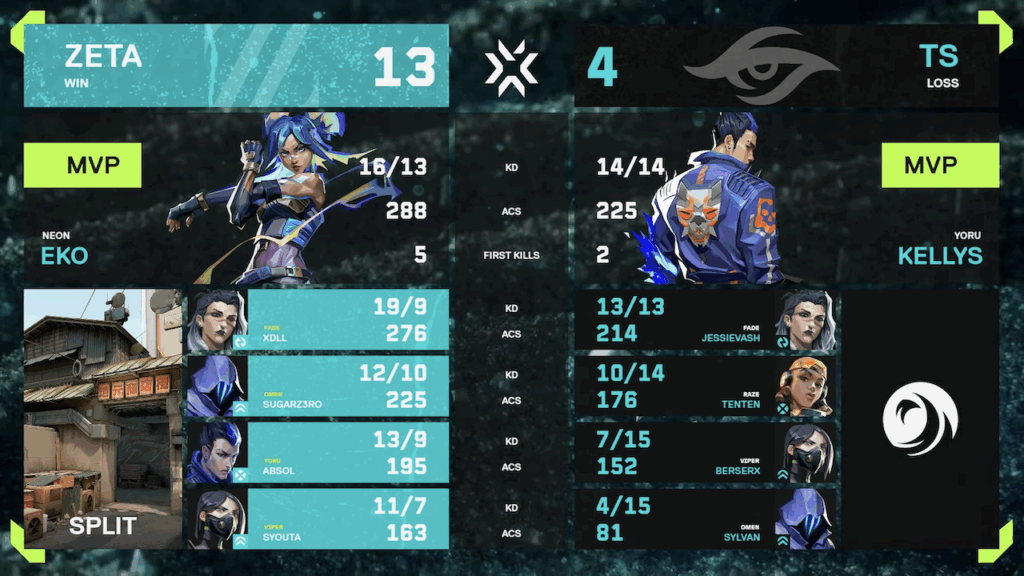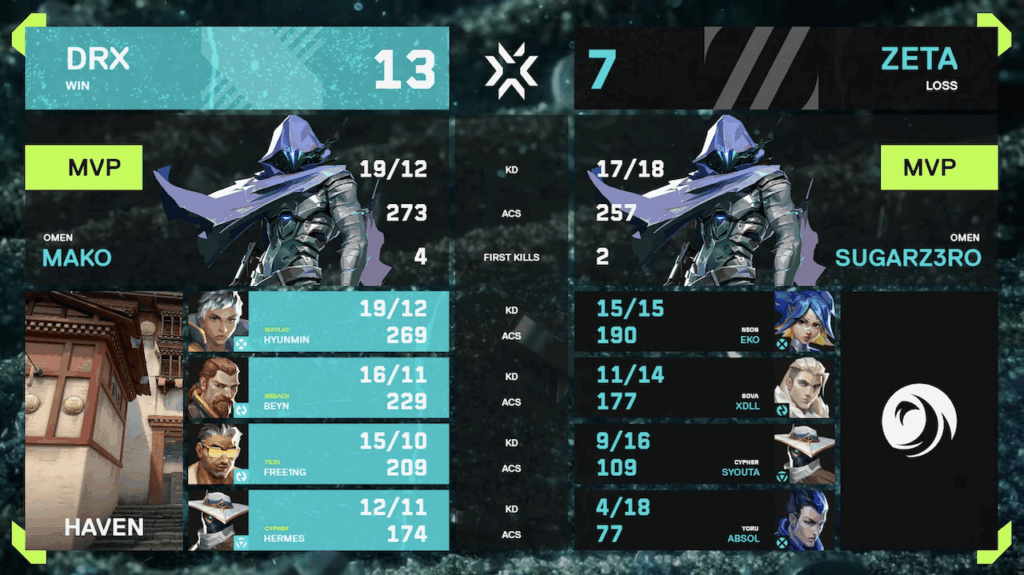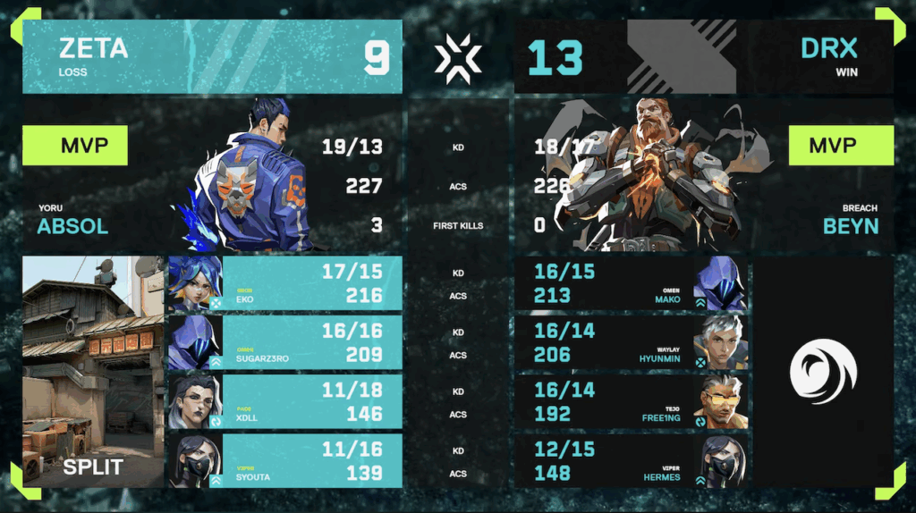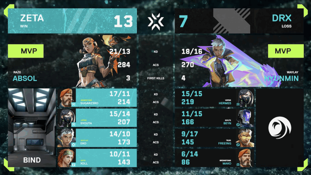 2月7日(土)に行われたDRX戦では、1 Map目のHAVENにて序盤相手にリードされたものの後半で巻き返しましたが相手の対応を上回ることができず敗北。2 Map目のBINDでは、自分たちの強みを存分に押し出すプレイで13-7とマップを奪い返しました。続く3 MAP目のSPLITでは開幕から主導権を握り大差で折り返すも、後半の相手の猛攻を最後まで食い止めることができず8-13で敗れ、Kickoffは9-10位という結果で終わりました。