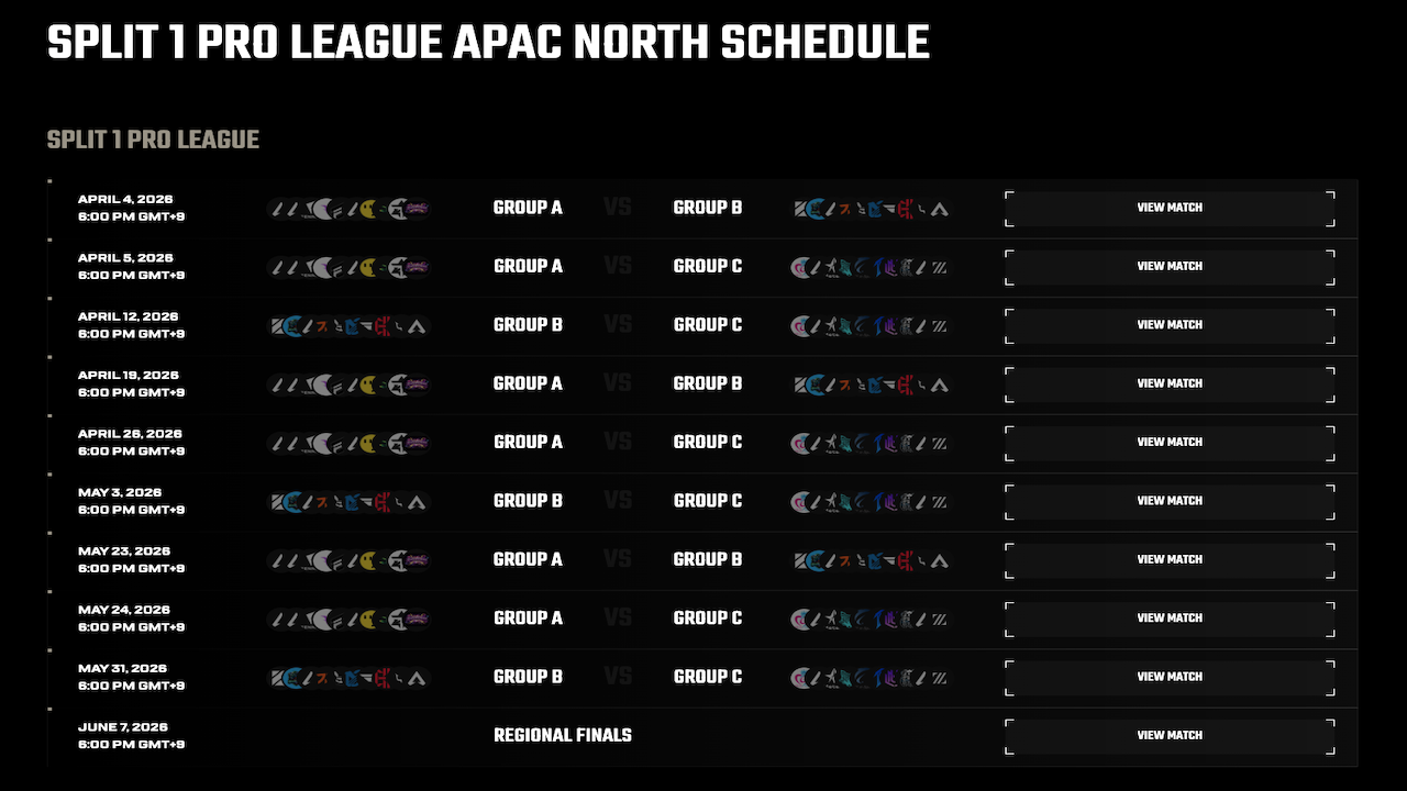 『ALGS26 S1 PL – APAC North』は、世界大会である『Apex Legends Global Series: 2026 Split 1 Playoffs』(以下『ALGS26 S1 Playoffs』)への出場権をかけて4月4日(土)から6月7日(日)まで行われる公式プロリーグです。本大会は、前年度の実績に基づき招待されたチームと、『Apex Legends Global Series 2026: Online Open – APAC North』(以下『ALGS26 Online Open – APAC North』)の激戦を勝ち抜いた8チームを合わせた、合計30チームが出場します。グループ分けは、シード順に基づき10チームずつ3つのグループ(A/B/C)に振り分けられ、各グループが互いに対戦するトリプルラウンドロビン(総当たり戦)形式で戦います。さらに、5月31日(日)の試合終了時点での上位20チームは、最終日に行われる『Regional Finals』へと進出し、マッチポイント方式による最終決戦に挑みます。マッチポイント方式の勝者に加えて、全日程を通じてポイントを多く獲得した上位8チームの合計9チームが、APAC North代表としてYear 6最初の世界王者決定戦となる『ALGS26 S1 Playoffs』への出場権を獲得します。