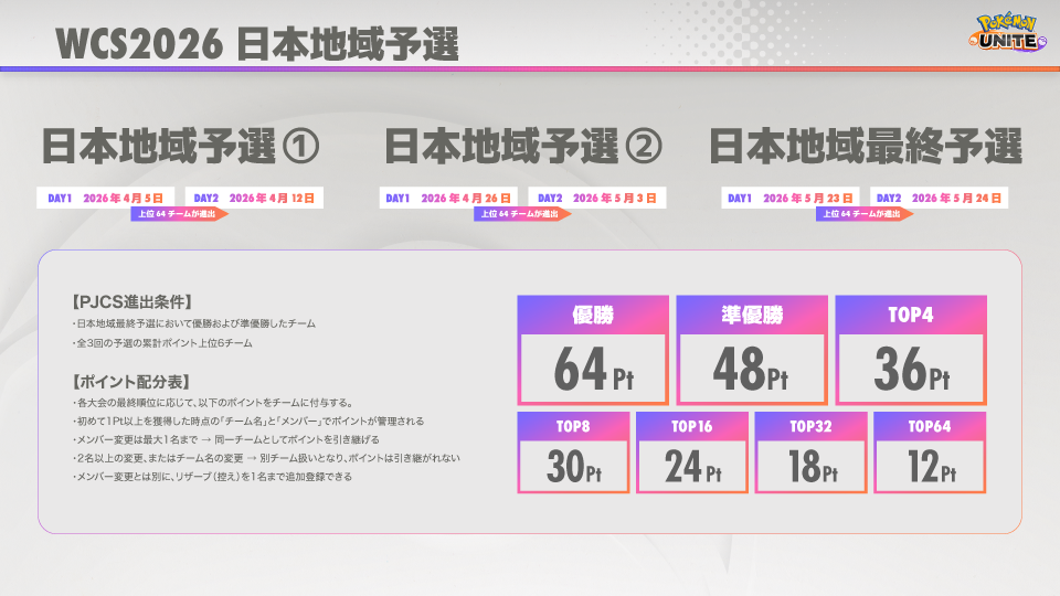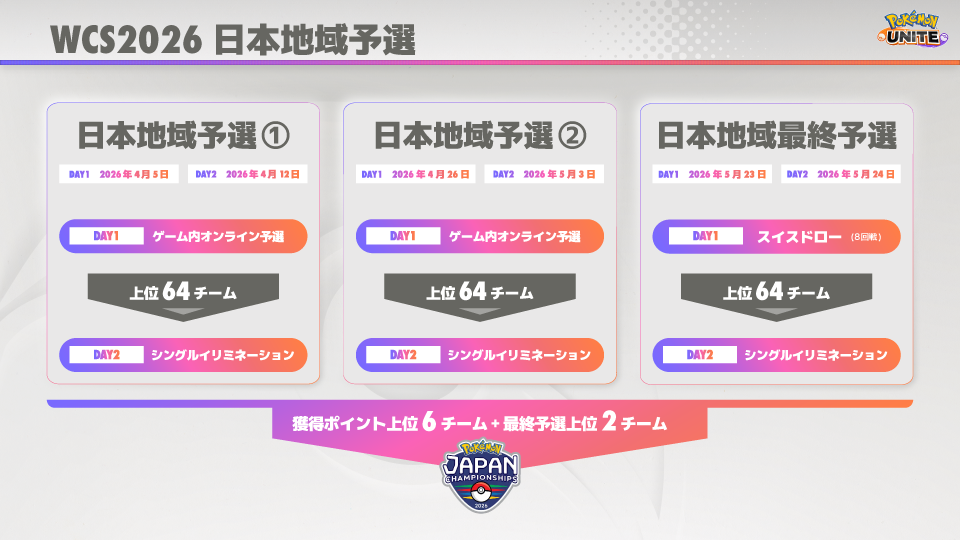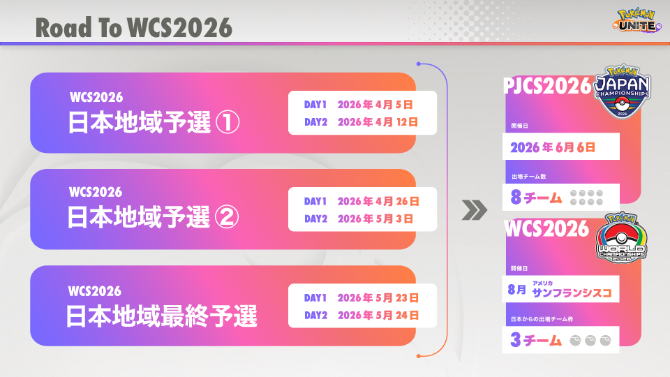 『WCS2026 日本地域予選』は『Pokémon UNITE World Championship 2026』へと繋がる『ポケモンジャパンチャンピオンシップス2026」』(以下『PJCS2026』)への出場権をかけて行われる大会です。本大会では、ゲーム内オンライン予選を使用した日本地域予選①・②と、日本地域最終予選の計3回が開催されます。