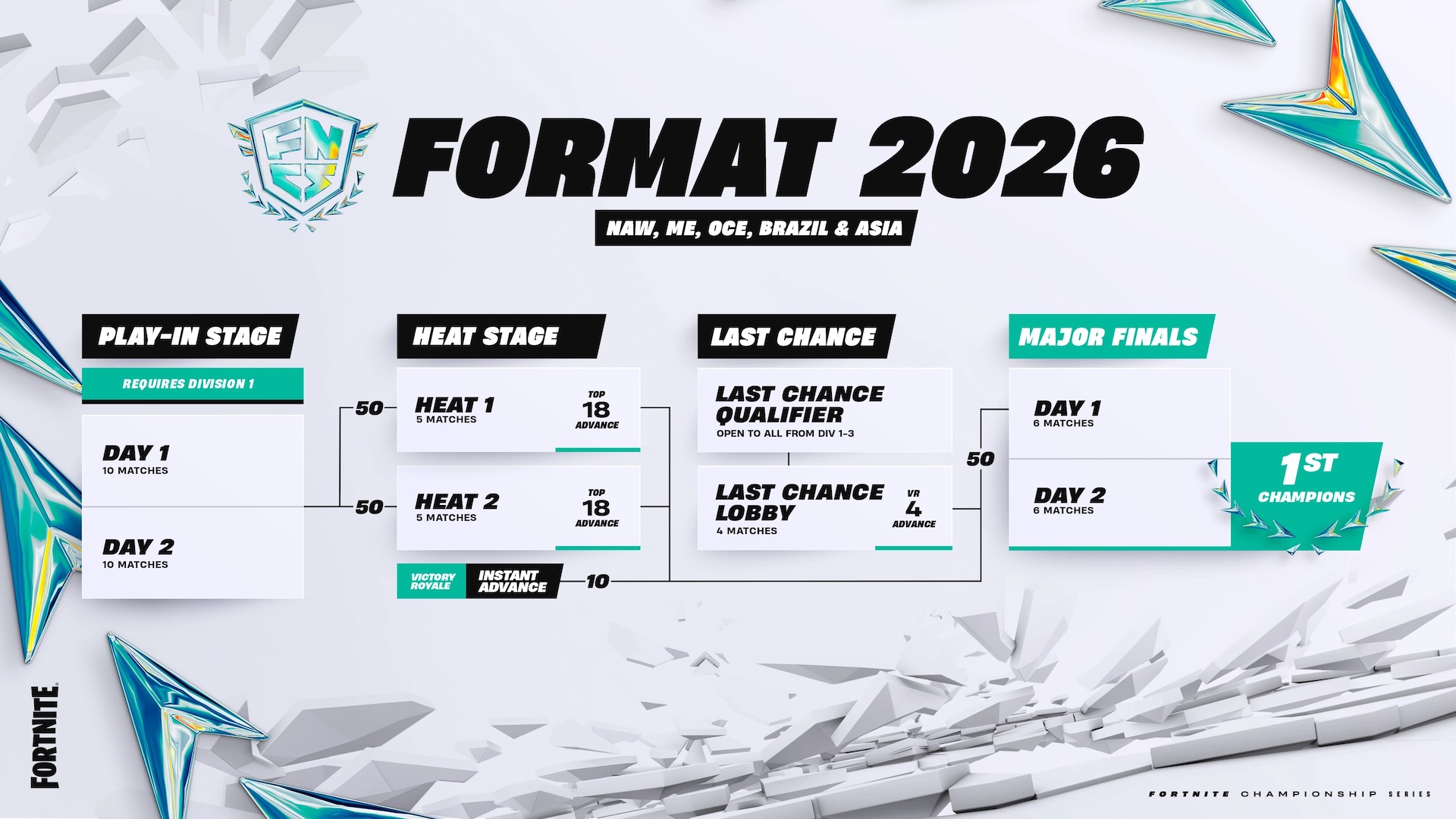 Major 1はプレイインステージ、ヒートステージ、ラストチャンス予選、メジャー決勝の4段階に分かれており、Major 1の上位3組がオフラインの世界大会『Fortnite Champion Series 2026 Major 1 Summit』への出場権を獲得します。
