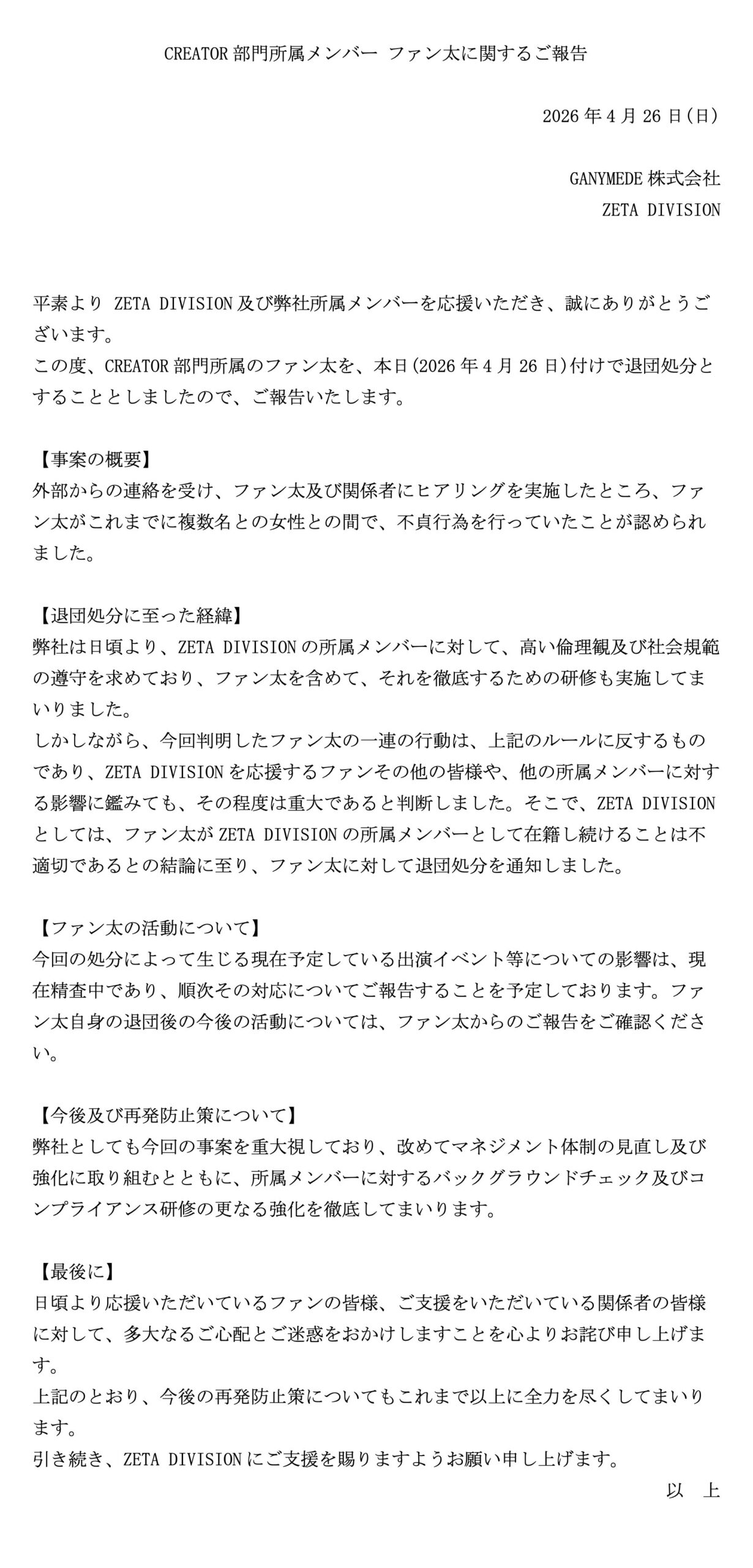 CREATOR部門 所属メンバー ファン太に関するご報告