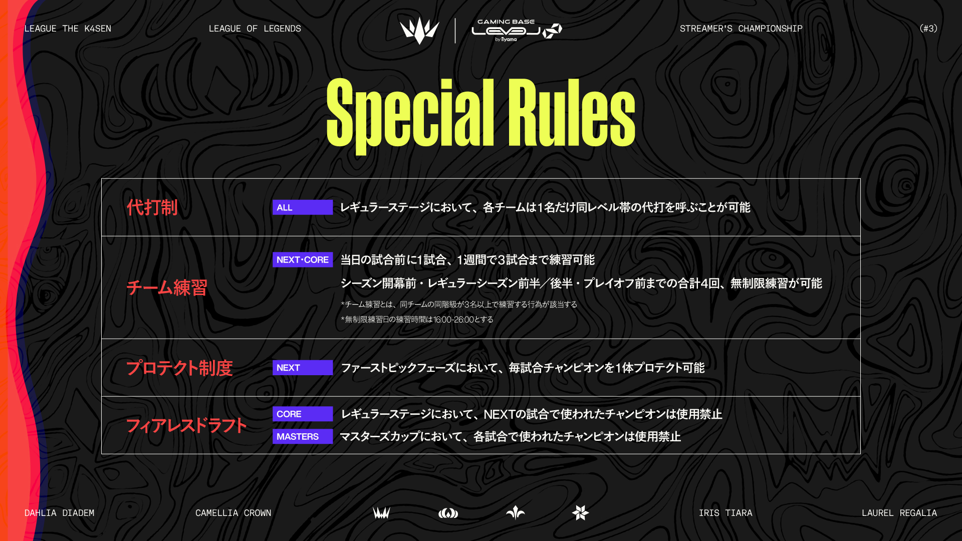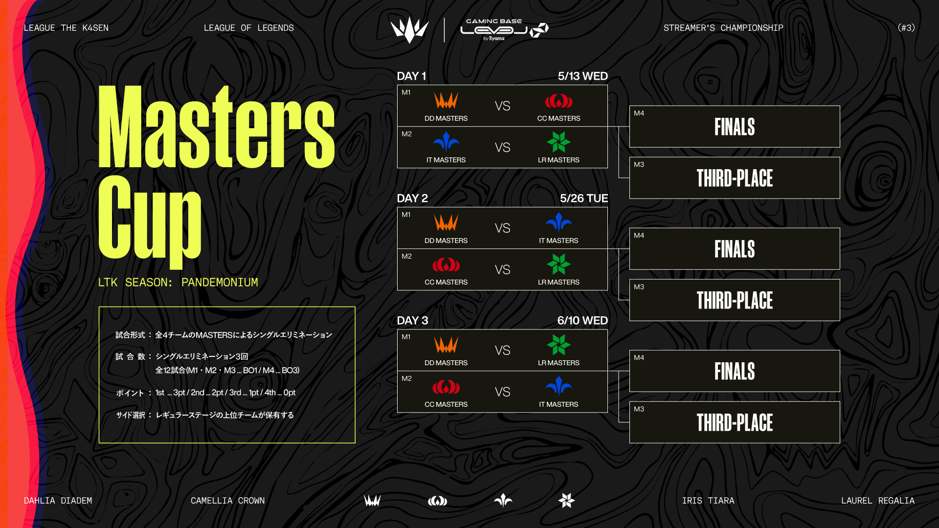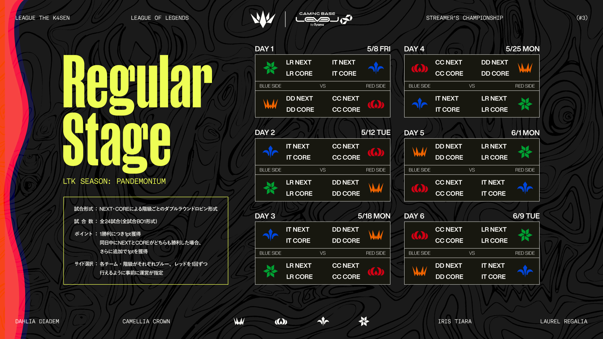 5月8日(金)から6月21日(日)までを『LTK シーズン: パンデモニウム』とし、レギュラーステージ6日間、そして新設されたMASTERS階級のトーナメント3日間、プレイオフステージ2日間の計11日間にわたって行われます。