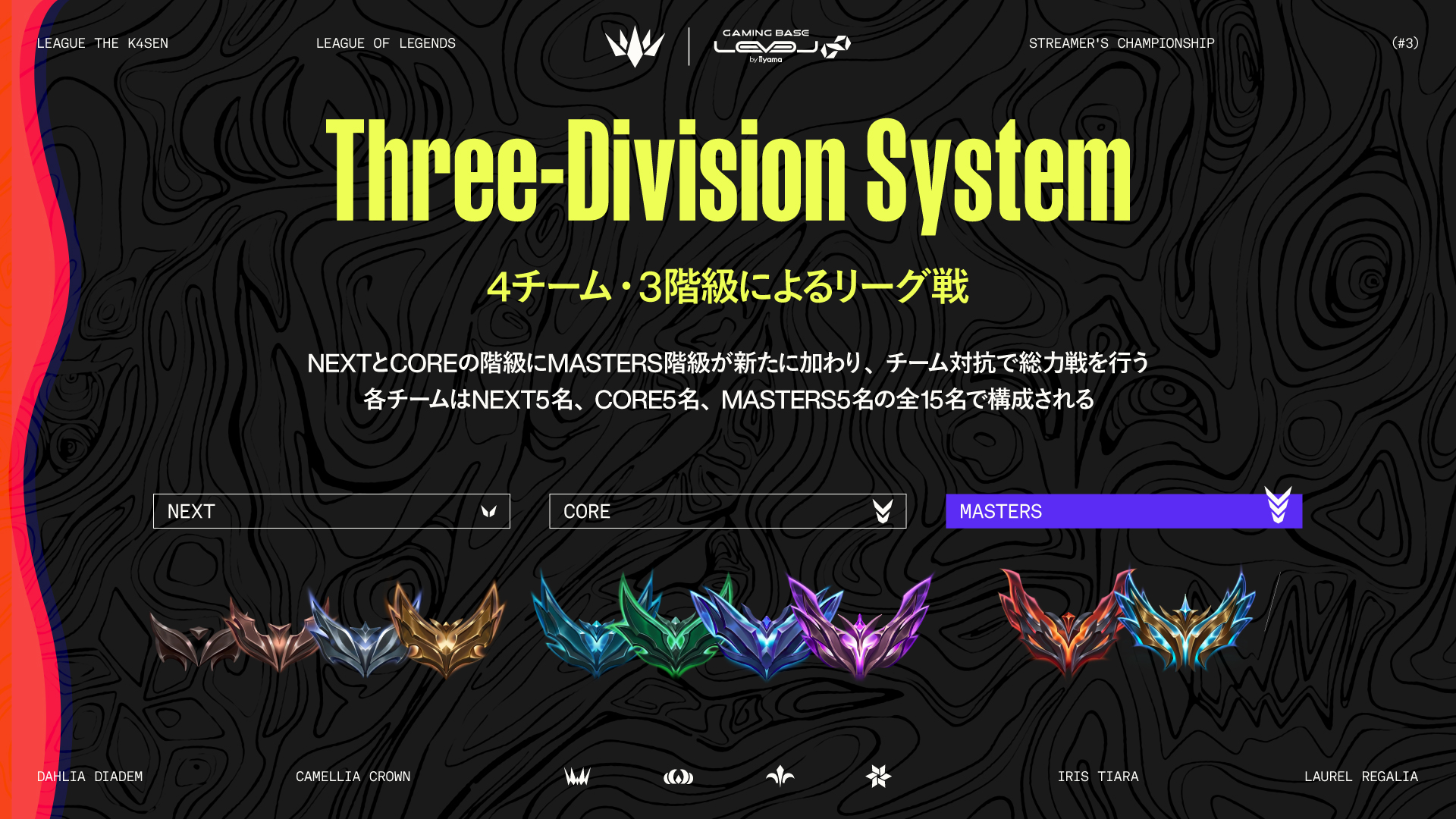 各チームに初心者(NEXT)、中級者(CORE)、上級者(MASTERS)の3つの階級(DIVISION)を設け、チーム対抗で総力戦を行います。